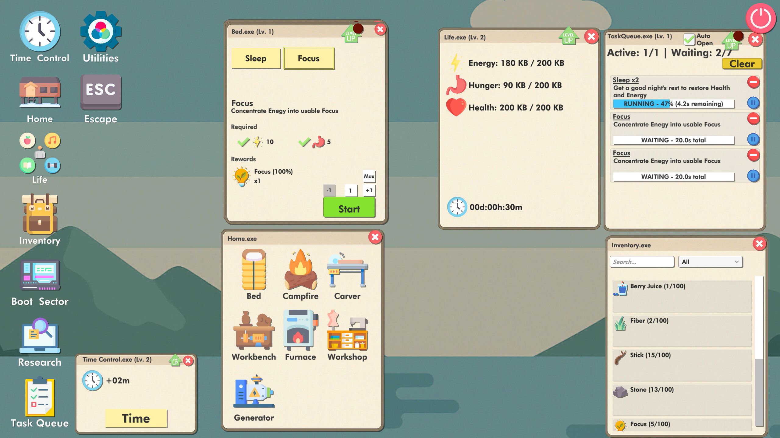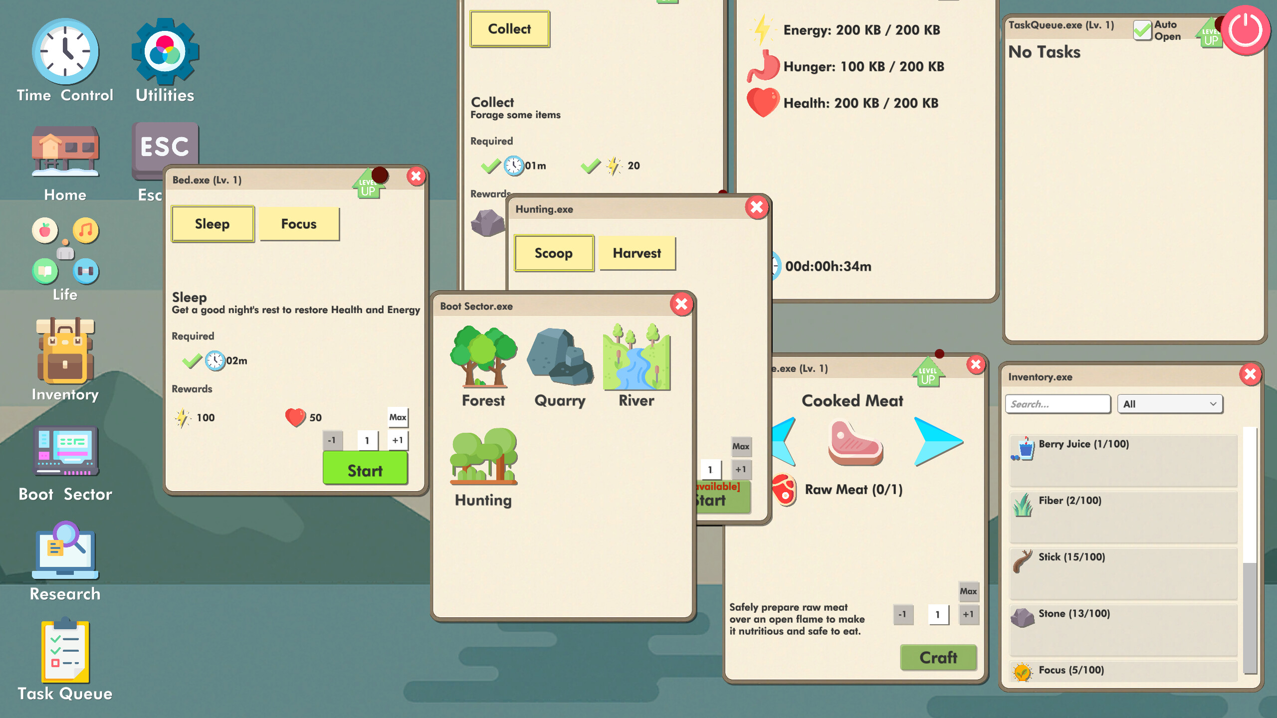 - 🍖 Resource Gathering – Hunt, cook, and craft using apps and files scattered across the desktop.